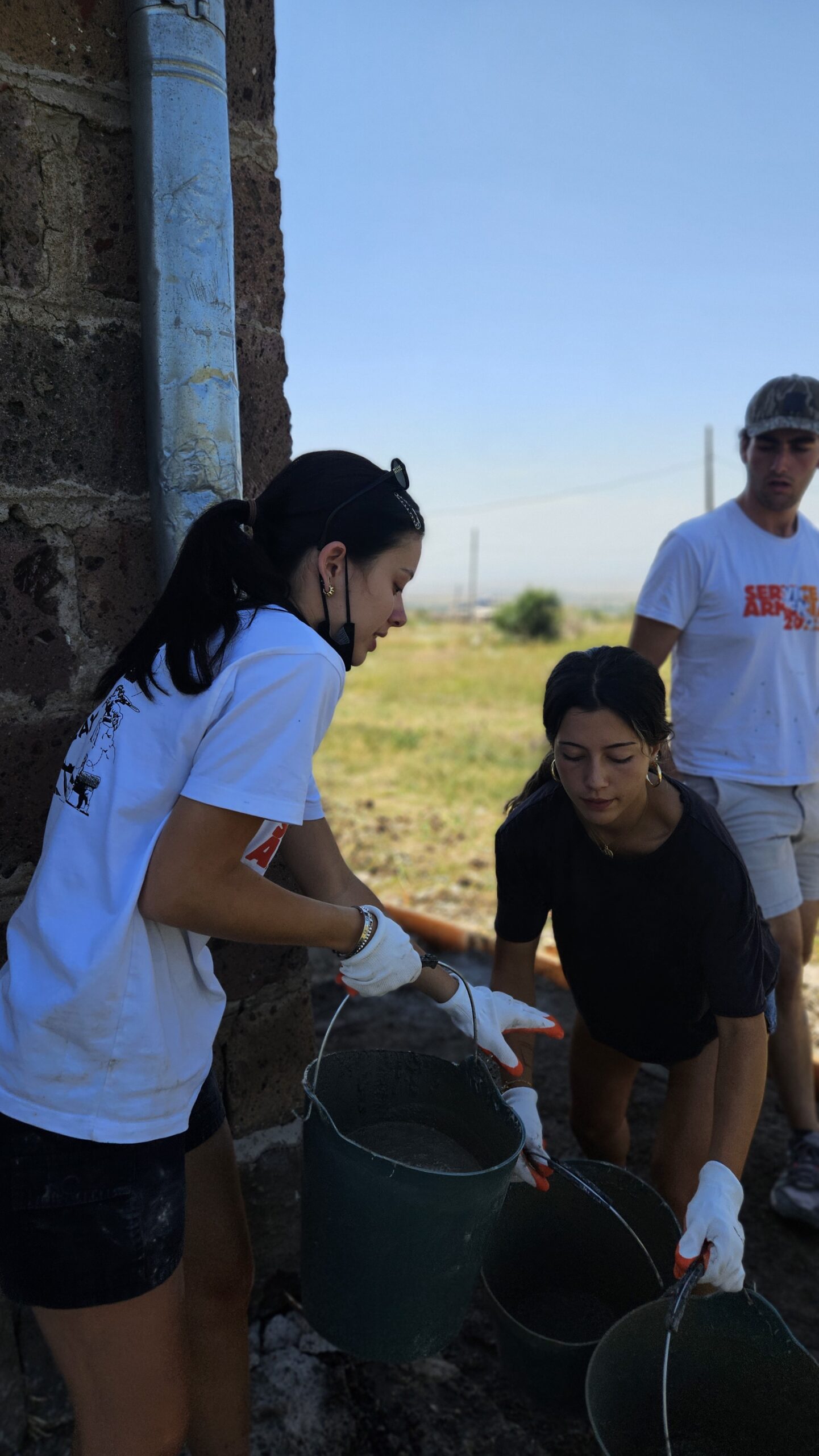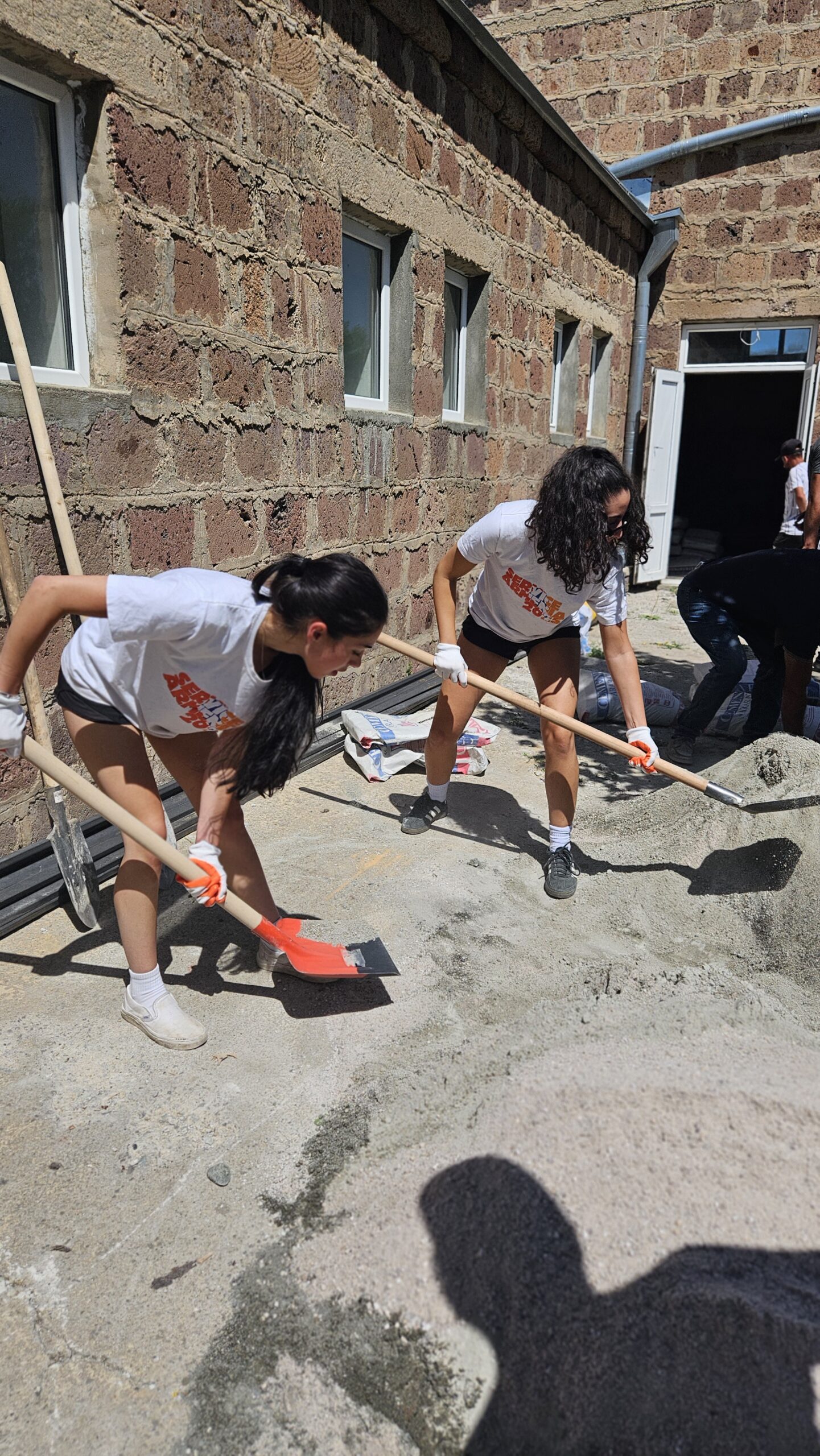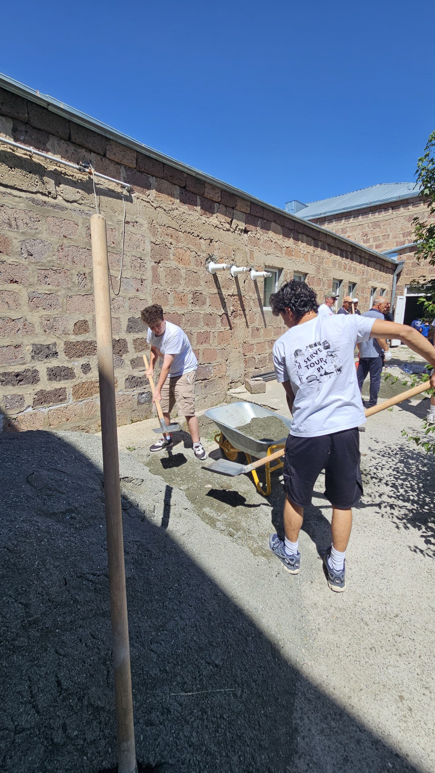 SERVICE Armenia 2025 participants spend the afternoon working hard to mix and poor cement to pave the outer walkway around the Shgharshik gym. This walkway also serves as a preventative measure for water intrusion.Â